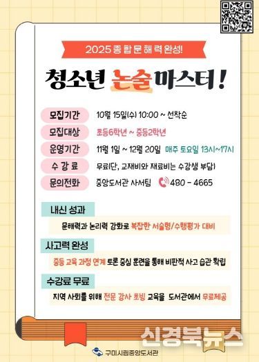 [신경북뉴스] 구미시립중앙도서관은 청소년들의 기초 문해력과 논리적 사고력 향상을 위해 마련한 논술특별프로그램 ‘청소년 논술마스터’ 수강생을 시립중앙도서관 누리집에서 선착순으로 모집하고 있다.