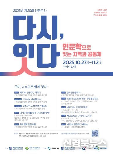 [신경북뉴스] 구미시에서는 한국연구재단(교육부)과 구미시가 공동으로 지원하고 계명대학교 목요철학원이 주관하는 인문도시조성지원사업의 일환으로 오는 10월 27일부터 11월 2일까지 일주일간 제20회 인문주간을 운영한다.