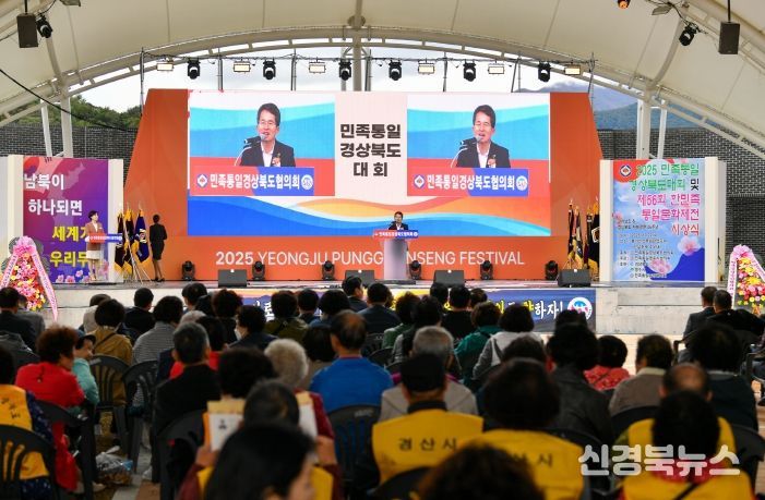 [신경북뉴스] 영주시는 지난 22일 풍기읍 남원천 일원 풍기인삼축제장 주무대에서 민족통일협의회 창설 44주년을 기념하는 ‘2025 민족통일경상북도대회’와 ‘제56회 한민족통일문화제전 시상식’을 성황리에 개최했다고 밝혔다.