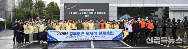 [신경북뉴스] 대구 남구는 지난 22일, KT 남대구지사 주차장에서 테러범에 의한 인질극 발생을 가정한 인질 구출, 테러범 진압 훈련 및 드론 테러에 의한 화재발생 시 대피훈련, 화재진압, 복구 작업 등 테러·화재 대비를 주제로 한 『2025 충무훈련 실제훈련』을 실시했다.