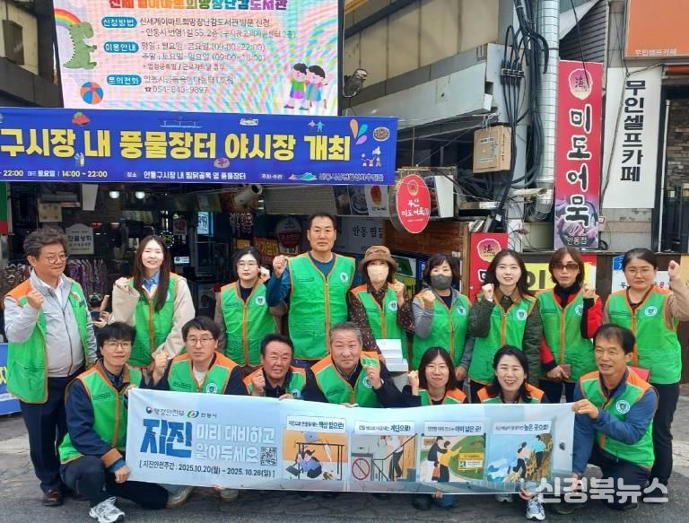 [신경북뉴스] 안동시는 10월 22일, 지진안전주간(10. 20.~10. 26.)을 맞아 안동시 자율방재단과 함께 구시장 찜닭골목 일대에서 시민을 대상으로 지진 안전 캠페인을 펼쳤다. 안동 구시장 찜닭골목은 많은 방문객과 유동 인구가 집중된 장소로, 재난에 대한 대응 교육과 홍보가 필요한 곳이다.