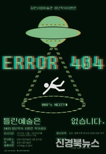 [신경북뉴스] 김천시시설관리공단이 운영하는 김천시립미술관은 지역 청년예술가의 창작 활동을 지원하고 예술적 성장을 돕기 위한 〈2025 청년작가 지원전 – ERROR 404 틀린 예술은 없습니다〉의 참여 작가를 모집한다고 밝혔다.