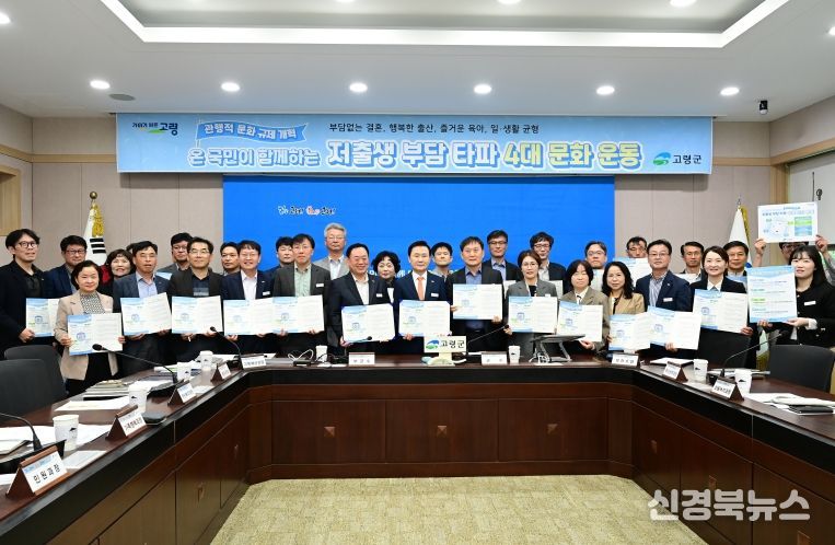 [신경북뉴스] 고령군은 10월 27일, 저출생 인식 개선 및 결혼·출산·육아 등에 부담을 주는 관행적 문화를 개혁하기 위해 『저출생 부담타파 4대문화운동』을 간부 공무원을 중심으로 우선 추진했다.