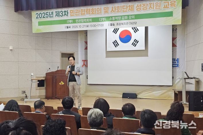 [신경북뉴스] 의성군은 10월 27일 종합복지관 대강당에서 관내 사회단체 임원 및 실무자 등 70여 명이 참석한 가운데 ‘2025년 제3차 민관협력회의 및 성장지원교육’을 개최했다고 밝혔다.
