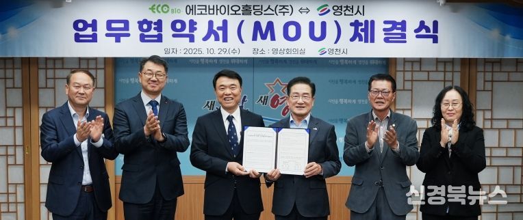 [신경북뉴스] 영천시는 29일 시청 영상회의실에서 최기문 시장, 송효순 에코바이오홀딩스㈜ 대표 등 관계자들이 참석한 가운데 ‘바이오가스 기반 청정수소 생산 통합사업’에 관한 업무협약(MOU)을 체결했다.