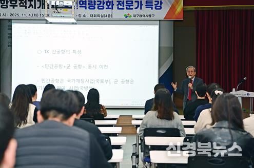 [신경북뉴스] 대구 동구청은 지난 4일 구청 대회의실에서 직원들을 대상으로 ‘공항후적지개발 직원 역량강화 전문가 특강’을 실시했다.