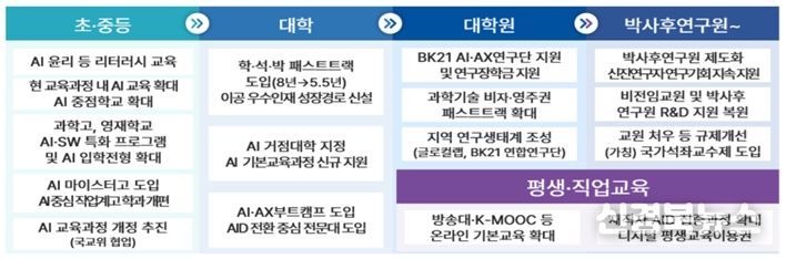 초‧중등 학생‧학부모 등을 대상으로 인공지능(AI) 교육을 실시하는 인공지능(AI) 교육지원센터를 2026년 3개 교육청에 우선 설립하고, 2028년까지 전국 17개 시‧도교육청 전체에 확대할 계획이다. 시‧도교육청-대학-기업이 함께 학교 인공지능(AI) 교육을 지원하도록 협력 체계 구축을 지원하며, 특히 학생들에게 다양한 인공지능(AI) 진로체험 기회를 제공할 예정이다.