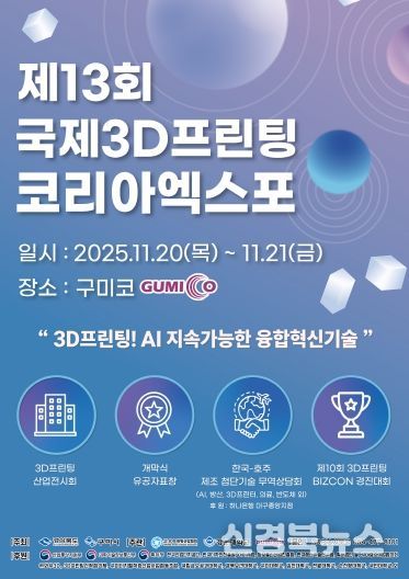 [신경북뉴스] 구미시는 11월 20일부터 21일까지 2일간 구미코에서 '제13회 국제3D프린팅코리아엑스포'를 개최한다. 올해로 13회를 맞이한 이번 행사는 3D프린팅 산업을 대표하는 전시회로, 3D프린팅 산업 활성화와 기술 교류를 위한 다양한 프로그램을 진행한다.