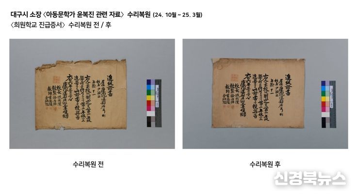 대구시(문화유산과) 소장 〈아동문학가 윤복진 관련 자료〉는 가요곡집과 졸업앨범 등 지역을 대표한 작가의 활동과 우리나라 동요사를 재조명하는 자료로 중요성을 인정받는 문화유산이었지만, 근대기 제작된 종이 수급이 어려워 수리복원에 많은 난항을 겪었다. 이에 대구간송미술관 수리복원팀은 자료와 유사한 종이를 직접 제작하여 결손부 보완 및 낙장 부분에 적용했고, 주변부와 유사한 색으로 색맞춤했다. 수리복원이 완료된 자료들은 지난 5월 대구예술발전소에서 개최된 전시 ‘수리복원, 기억을 잇다’를 통해 소개되며, 지역 출신 아동문학가 윤복진을 재조명하는 계기를 마련했다.