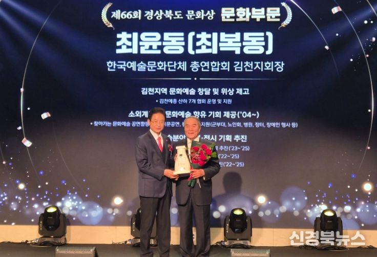 [신경북뉴스] 김천시는 지난 23일 안동 스탠포드호텔에서 열린 제66회 경상북도 문화상 시상식에서 최복동 한국예총 김천지회장(문화 부문), 김대철 도문요 대표(시각예술 부문)가 각각 수상했다고 밝혔다.