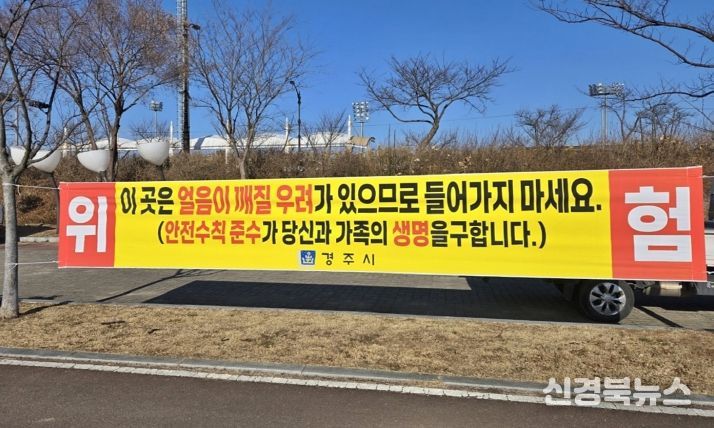 이에 경주시는 결빙 구간을 중심으로 얼음썰매 이용 금지와 출입 자제를 알리는 안전 홍보 현수막을 게시했다.