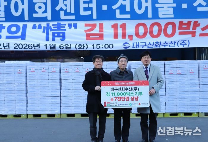 [신경북뉴스] 대구농수산물도매시장 내 대구신화수산(주)(대표 고중근)은 1월 6일 대구농수산물도매시장에서 대구사회복지공동모금회를 통해 김 1만 1천 박스(7천만 원 상당)를 기부했다.