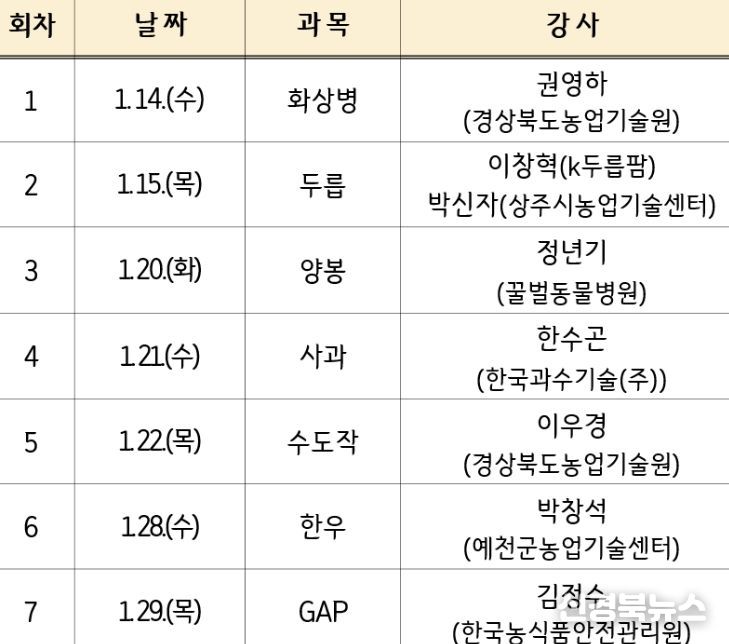 일정과 과목은 14일 화상병 과정을 시작으로, 15일 두릅, 20일 양봉, 21일 사과, 22일 수도작, 28일 한우, 29일 GAP과정까지 총 7개 과정으로 이뤄진다.