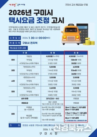 [신경북뉴스] 구미시는 오는 1월 30일 00시부터 구미시 전 지역의 택시요금을 조정 시행한다.