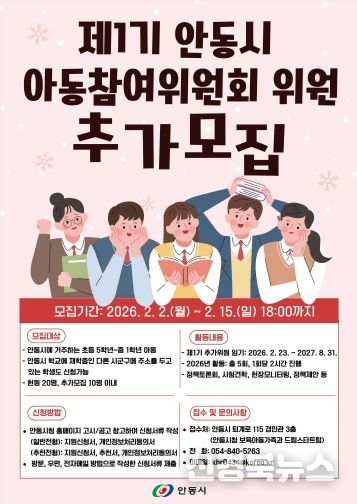 [신경북뉴스] 안동시는 아동의 권리를 보장하고 아동친화적인 정책 수립을 위해 운영 중인 제1기 안동시 아동참여위원회의 위원을 2월 2일부터 추가로 모집한다.