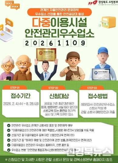 [신경북뉴스] 경상북도소방본부는 자율안전관리 문화 정착을 위한 ‘다중이용업소 안전관리 우수업소’ 신규 신청을 오는 8월 28일까지 접수한다고 밝혔다.