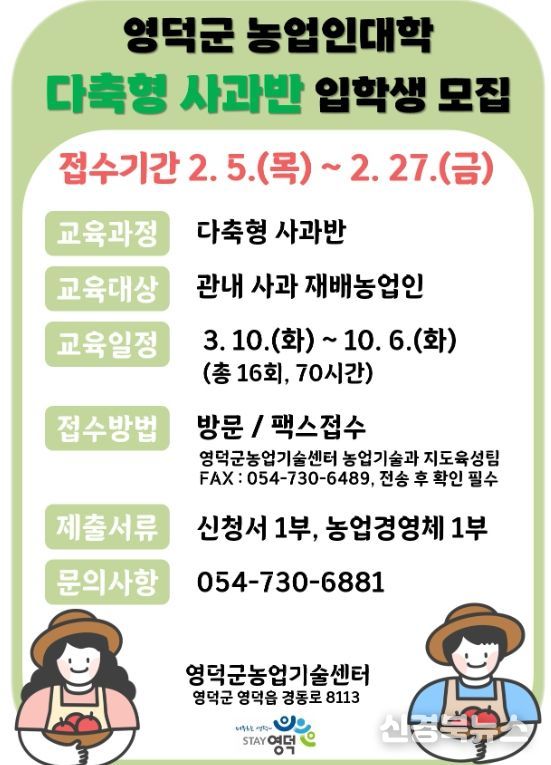 [신경북뉴스] 영덕군은 변화하는 농업 환경에 대응하고 사과 재배 기술의 전문화를 도모하기 위해 이달 5일부터 27일까지 ‘2026년 영덕군 농업인대학 다축형 사과반’ 교육생을 모집한다.