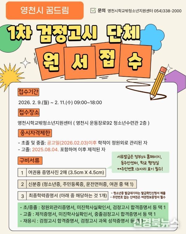 [신경북뉴스] 영천시학교밖청소년지원센터는 학교 밖 청소년의 학력 취득을 지원하기 위해, 오는 4월 4일 실시 예정인 2026년 제1회 초·중·고등학교 졸업학력 검정고시와 관련해 원서접수 대행 서비스를 9일부터 11일까지 운영한다고 밝혔다.