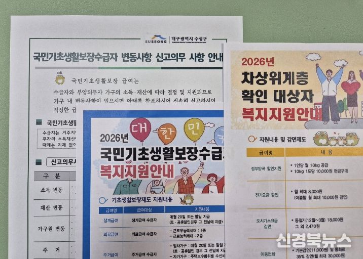 [신경북뉴스] 대구 수성구는 2026년 기초생활보장제도 개선 및 기준 완화에 발맞춰 복지사각지대를 해소하고 주민 체감도를 높이기 위한 맞춤형 복지사업을 본격 추진한다고 밝혔다.