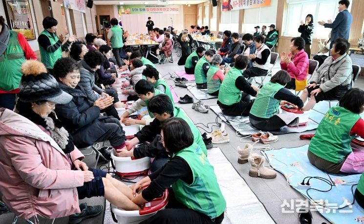 [신경북뉴스] 군위군새마을회(회장 박택관) 산하 직장공장새마을운동군위군협의회(회장 김천일)는 9일 오후, 효령면행정복지센터에서 지역 어르신 60여 명을 모시고‘찾아가는 공경문화 족욕봉사’를 실시했다.
