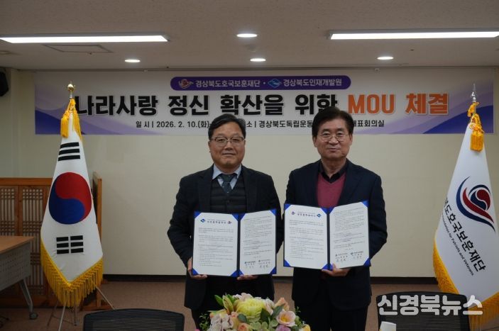 [신경북뉴스] 경상북도인재개발원(원장 우광진)과 (재)경상북도호국보훈재단(대표이사 한희원)은 2월 10일 오후 2시, (재)경상북도호국보훈재단 국민대표회의실에서 나라사랑 정신을 계승·확산하기 위한 업무협약(MOU)을 체결했다.