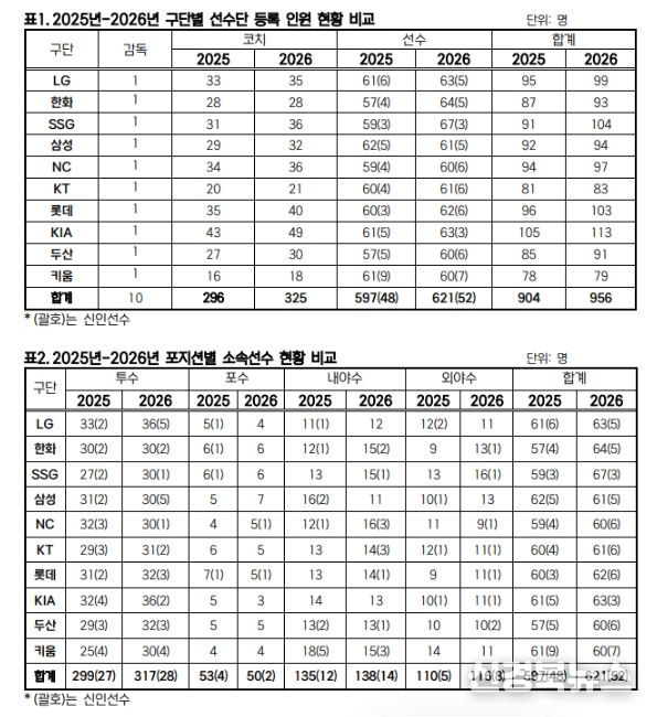 [신경북뉴스] KBO는 2월 10일(화) 2026년 KBO 리그 소속 선수 명단을 공시했다. 10개 구단은 총 621명의 선수를 등록해, 597명이 등록했던 2025년보다 24명이 늘어났다.