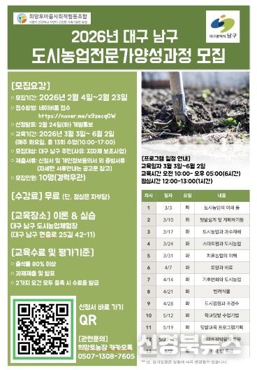[신경북뉴스] 대구 남구는 도시농업에 대한 전문적인 지식을 전달하고 현장 실무 역량을 갖춘 인력을 양성하기 위해 ‘2026년 도시농업전문가 양성과정’ 수강생을 모집한다고 밝혔다. 이번 과정은 도심 속 농업의 가치를 확산시키고 구민들에게 새로운 직업 역량 강화 및 사회 참여의 기회를 제공하기 위해 기획됐다.