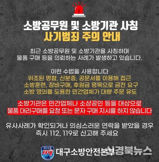 [신경북뉴스] 대구소방안전본부는 최근 소방공무원과 소방기관을 사칭해 물품 구매나 계약 체결을 유도하는 사기 범죄가 잇따르고 있다며 시민과 업체에 각별한 주의를 당부했다.