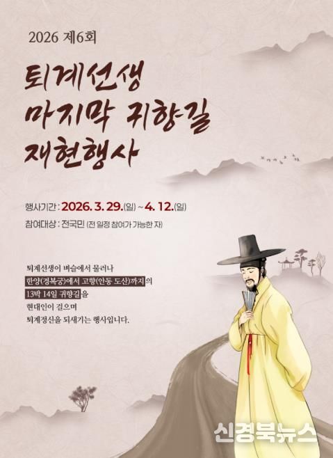제6회 퇴계귀향길 재현행사는 오는 3월 30일부터 4월 12일까지 13박 14일간 개최되며, 참가 신청은 경북문화재단 누리집을 통해 2월 22일까지 접수한다. 기타 세부 일정과 프로그램은 관계자 협의와 준비 과정을 거쳐 추후 안내될 예정이다.