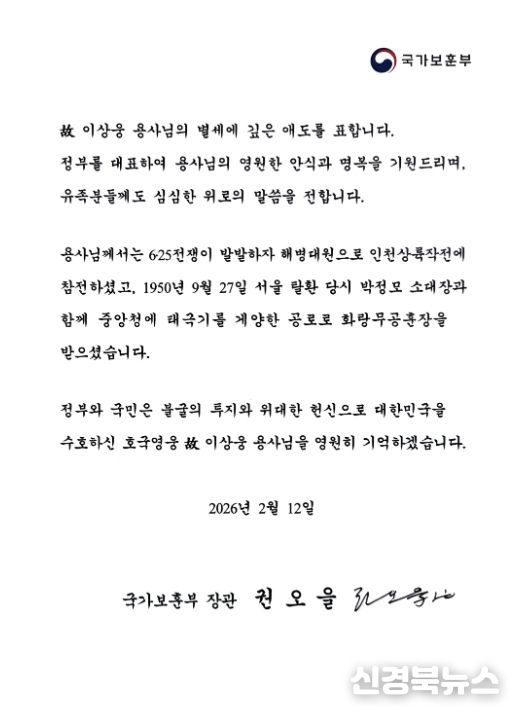 [신경북뉴스] 6‧25전쟁이 한창이던 1950년 9월, 아군의 서울수복 당시 박정모 소대장과 함께 중앙청에 태극기를 게양했던 이상웅 참전용사가 별세함에 따라 권오을 국가보훈부 장관이 13일 조전을 보내 “호국영웅을 영원히 기억하겠다”며 고인의 명복을 빌었다.