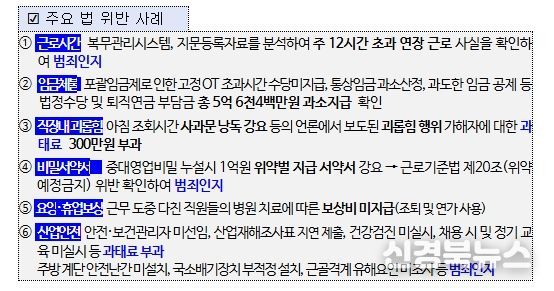 이와 함께 연장·야간·휴일근로 수당 등 임금 미지급 5억 6천4백만원에 대해서도 시정지시했다.
