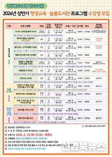 [신경북뉴스] 경상북도교육청 청도도서관(관장 조은희)은 2월 19일부터 지역주민을 대상으로 2026년 상반기 평생교육 및 늘봄도서관 프로그램 수강생을 모집한다.