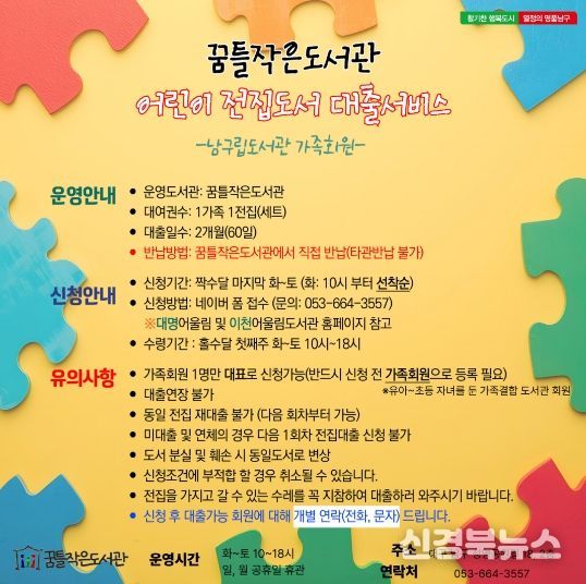 [신경북뉴스] 대구 남구는 오는 2월 24일 화요일 10시부터 꿈틀작은도서관에서 ‘전집대출’ 서비스를 운영한다고 밝혔다.