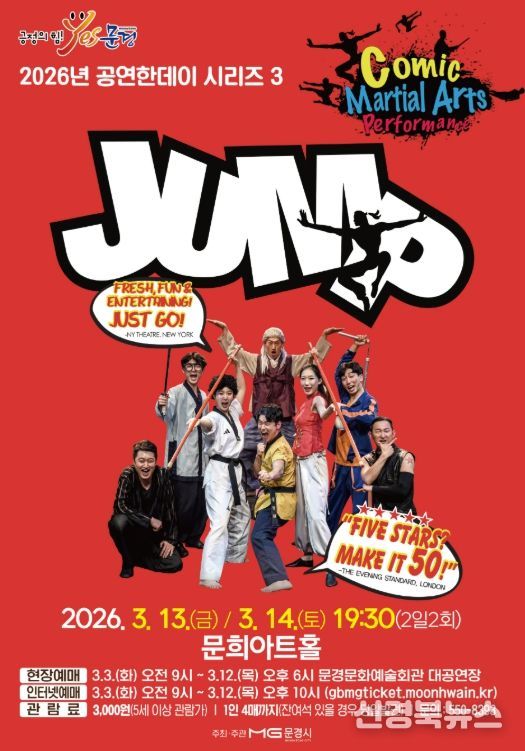 [신경북뉴스] 문경문화예술회관에서는 화려한 공중회전을 선보이는 아크로바틱과 고난이도 동양 무예, 슬랩스틱 코미디가 어우러진 넌버벌 퍼포먼스 점프(JUMP) 공연을 3월 13일 19:30, 14일 19:30 (2일 2회)에 문희아트홀에서 개최한다.
