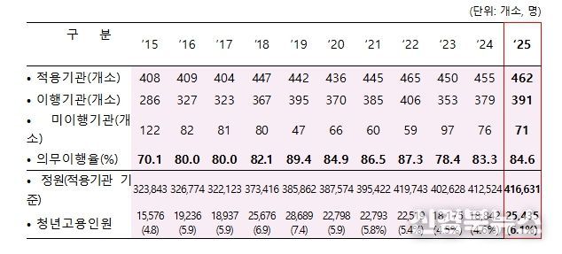 2025년 공공기관 청년고용의무 이행결과에 따르면, 적용기관 462개소의 84.6%(391개소)가 청년고용의무를 이행한 것으로 조사되어 2024년(83.3%, 379개소) 대비 1.3%p(+12개소) 증가했다.
