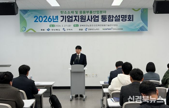 [신경북뉴스] 경상북도는 27일 구미시 산동읍 경북테크노파크 인조흑연응용기술연구센터에서 '2026년 탄소산업 기업지원사업 통합설명회'를 열었다. 행사에는 도내 기업과 관련 기관 관계자 50여 명이 참석했다.