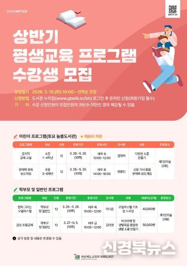 [신경북뉴스] 경상북도교육청 봉화도서관이 지역 주민을 대상으로 상반기 평생교육과 토요 늘봄도서관 프로그램의 수강생을 모집한다.