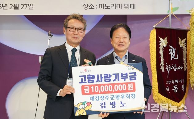 [신경북뉴스] 김병노 재경성주군향우회장이 지난달 27일 서울 종로구에서 개최된 '2026년 재경성주군향우회 신년 교례회'에서 고향사랑기부금 1,000만 원을 전달했다.