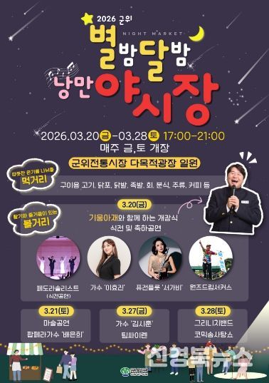 [신경북뉴스] 군위군이 전통시장 활성화와 지역민, 관광객들에게 봄밤의 특별한 경험을 제공하기 위해 '군위전통시장 별밤달밤 낭만 야시장'을 3월 20일부터 3월 28일까지 매주 금요일과 토요일에 연다.