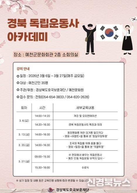 [신경북뉴스] 경상북도호국보훈재단이 3월 6일부터 3월 27일까지 예천문화원에서 '경북 독립운동사 아카데미'를 개최한다.