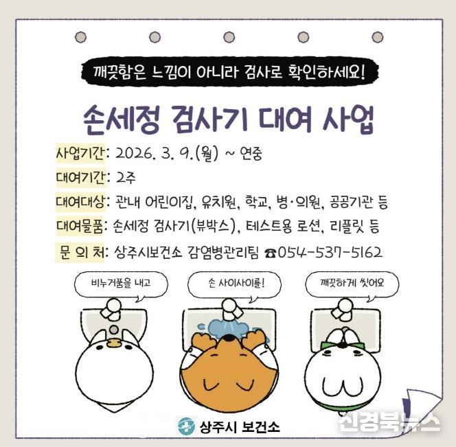 [신경북뉴스] 상주시보건소가 지역 내 어린이집, 유치원, 학교, 공공기관을 대상으로 손세정 검사기 대여 서비스를 3월부터 연중 제공하고 있다.