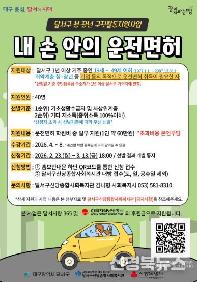 [신경북뉴스] 달서구는 경제적 어려움으로 운전면허 취득이 어려운 청·장년 취약계층을 대상으로 구직활동을 돕는 '내 손 안의 운전면허' 사업을 3월부터 시작한다.