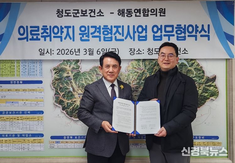 [신경북뉴스] 청도군은 지난 3월 6일 해동연합의원과 의료취약지 원격협진사업 추진을 위한 업무협약을 맺고, 해동연합의원을 협력 의료기관으로 지정했다.