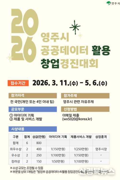 [신경북뉴스] 영주시는 공공데이터를 활용한 창업 활성화를 위해 3월 11일부터 5월 6일까지 '2026년 영주시 공공데이터 활용 창업경진대회' 참가자를 모집한다.