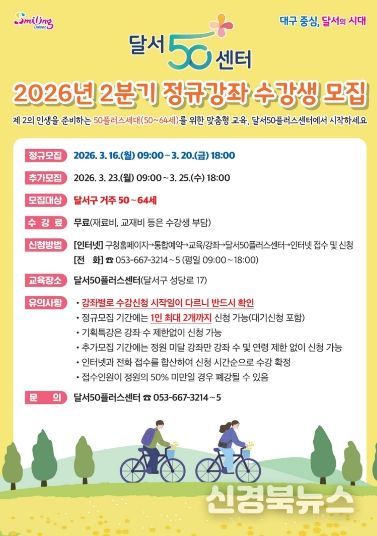 [신경북뉴스] 대구 달서구가 50~64세 중장년층을 대상으로 달서50플러스센터의 2분기 정규강좌 수강생을 3월 16일부터 25일까지 선착순 모집한다.