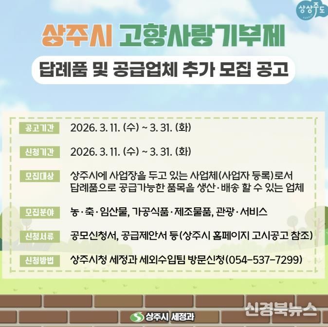 [신경북뉴스] 상주시는 고향사랑기부제 답례품과 공급업체를 추가로 모집한다.