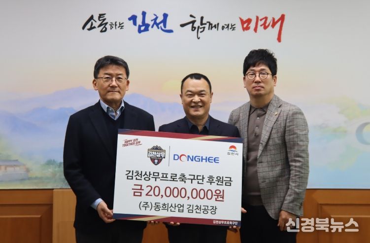 김천상무프로축구단은 3월 13일 김천시청에서 동희산업의 후원금 전달식을 개최했다. 이 자리에는 동희산업 박주은 대표이사, 박치완 상무, 김영진 경영기획팀장, 한명희 매니저와 김천상무 이재하 대표이사가 참석했다.