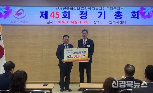 [신경북뉴스] 사)한국외식업중앙회 경북지회 고령군지부 임직원들이 3월 16일 고령군 노인복지센터 강당에서 열린 제45회 정기총회에서 교육발전기금 200만원을 전달했다. 이 기금은 지역 내 교육 환경 개선과 인재 육성에 쓰일 예정이다.