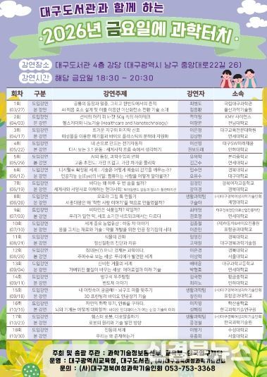 [신경북뉴스] 대구도서관이 시민들에게 과학기술과 연구 성과를 쉽게 전달하기 위해 '2026년 금요일에 과학터치' 강연 시리즈를 시작한다.