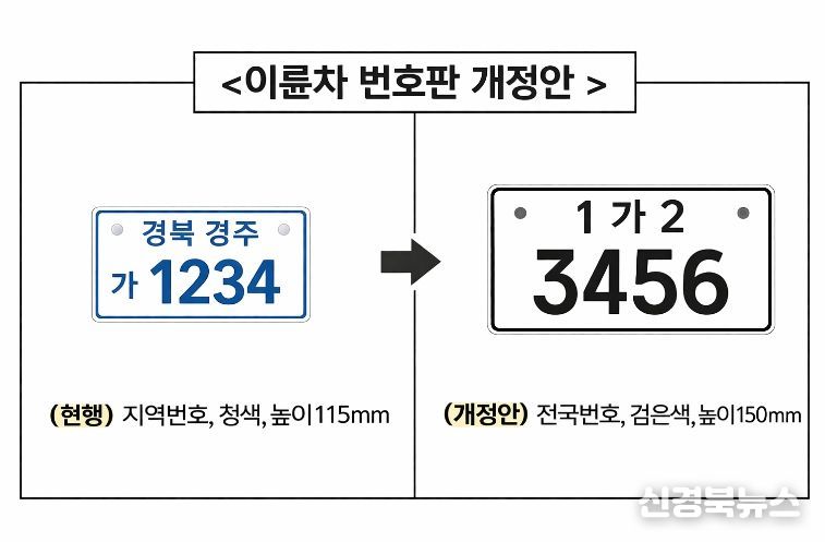 기존 이륜자동차 소유자는 번호판을 반드시 교체할 필요는 없으며, 신규 등록 또는 번호 변경 시부터 새로운 번호판이 적용된다. 경주시는 이번 제도 시행으로 지역 이동 시 번호판 재발급 절차가 사라져 이용자 불편이 줄고, 행정 관리와 단속의 정확성 및 신속성도 높아질 것으로 보고 있다.